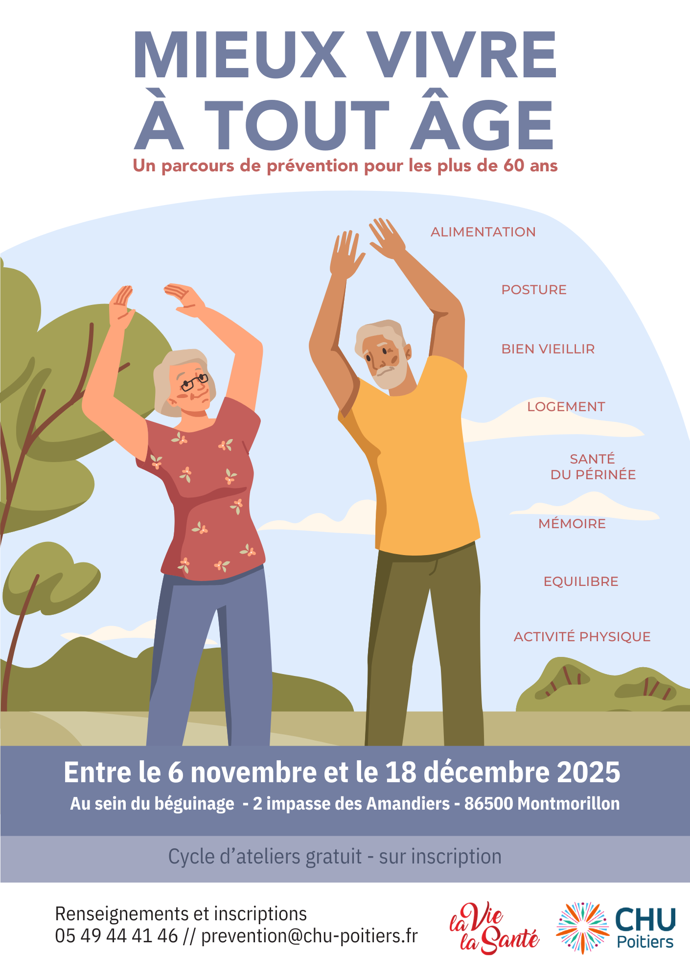 Les ateliers sont gratuits sur inscription, pour les plus de 60 ans autonomes. Infos et inscriptions au 05 49 44 41 46 ou prevention@chu-poitiers.fr