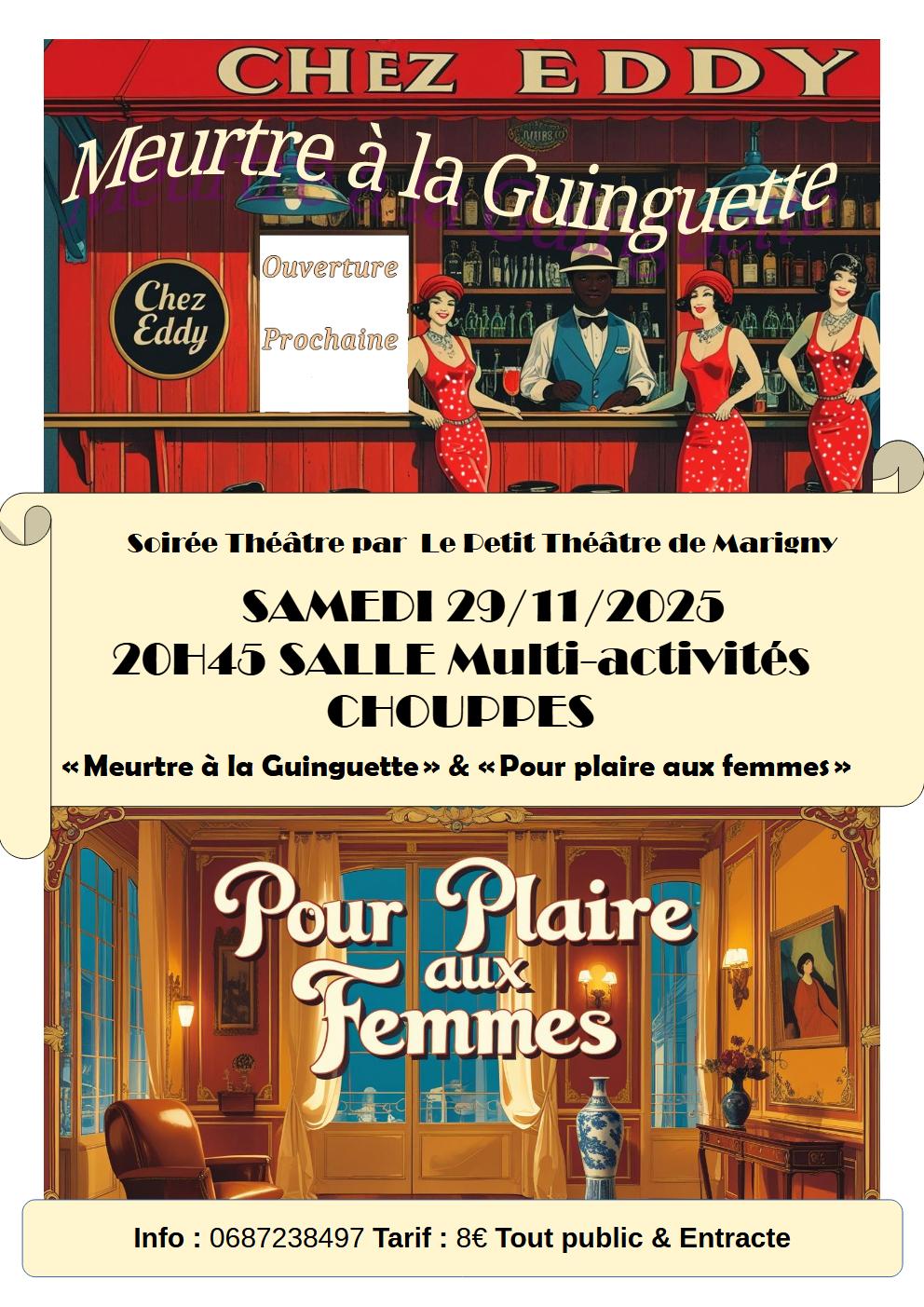 Ajouter à mon calendrierLe Petit Théâtre de Marigny, basé à Jaunay-Marigny 86 est heureux de venir présenter ses 2 nouvelles créations. Venez découvrir : « Pour plaire aux femmes » & « Meurtre à la guinguette » par Le Petit Théâtre de Marigny